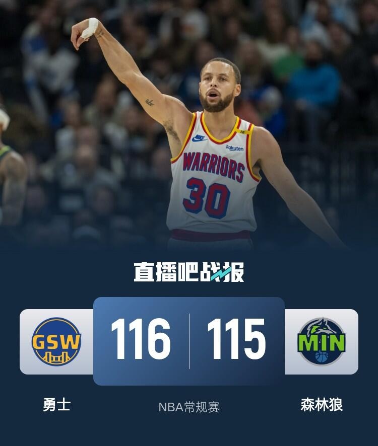 比赛开始,勇士率先发力,库里单节飙中4记三分独得12分,勇士攻防两端碾压对手首节34-12领先,次节森林狼进攻回暖,爱德华兹连中三分吹响球队反击的号角,勇士稳扎稳打保持优势,半场战罢勇士55-42领先森林狼。易边再战,双方大打对攻,森林狼不断冲击篮筐连投带罚继续迫近比分,末节森林狼持续展开反击,双方争夺陷入白热化,迪文岑佐连中三分,里德两罚全中扳平比分,库里关键三分穿针,维金斯两罚都有并抢下重要的前后场两个篮板,库里两罚全中后爱德华兹三分命中但也为时已晚。最终,勇士拒绝逆转,116-115险胜森林狼。