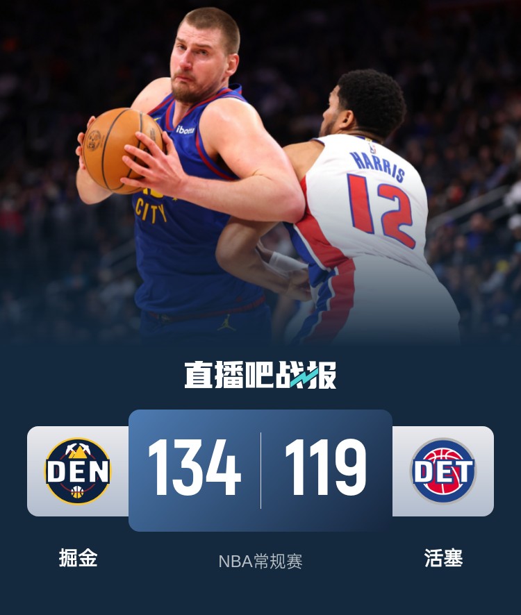 比赛开始,双方开场短暂相持,随后掘金飙中5记三分将分差拉开到两位数,比斯利手感火热连中三分带队追赶,次节活塞一度将分差迫近到只剩1分,掘金多点开花稳住局势,半场战罢掘金68-63领先活塞。易边再战,掘金攻防两端压制对手,轰出15-0一举将分差拉开到20分以上,康宁汉姆抢断反击贡献精彩隔扣2+1,末节掘金稳扎稳打保持优势,活塞换下主力投子认负。最终,掘金134-119大胜活塞,终结了对手的8连胜。