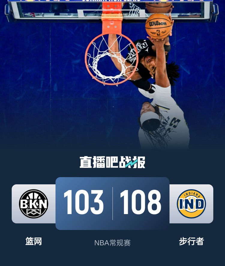 比赛开始,步行者上来7-0开局,篮网经历开局3分多钟慢热后连续外线发炮回应11-2,哈利伯顿状态不错单节上双,篮网总能回应,首节步行者领先3分,次节步行者外线连续4记三分重新拉开双位数领先,篮网全民皆兵追分,半场步行者还领先9分。下半场,双方继续拉锯战,沃特福德连续攻击内线助队追分,特纳外线能给出回应单节上双,麦康纳里突外投带队三节领先到20分,末节风云突变,步行者突然断电,篮网轰出21-2超级攻击波一举追到仅剩1分,西亚卡姆接连造杀伤稳住领先,再接关键抛投杀死比赛,哈利伯顿发球砸沃特福德背部被断后沃特福德再进三分,但马瑟林发球前被犯规拿一罚一掷,最终步行者拒绝逆转108-103再胜篮网,拿到4连胜同时送对手3连败。