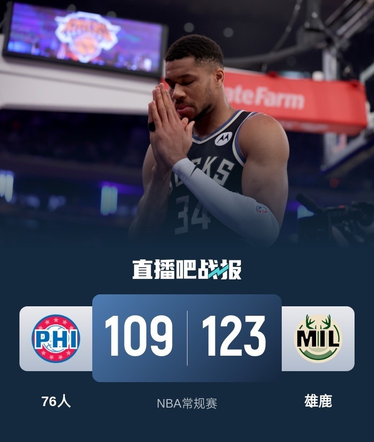1月20日讯 NBA常规赛,雄鹿今日迎战76人,前者近来取得三连胜,后者则是遭遇五连败,此役恩比德、乔治、亚布塞莱、德拉蒙德和小马丁等人缺战。