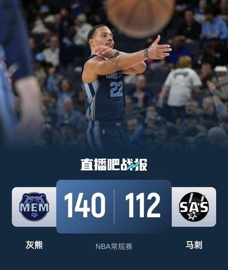 比赛上来,灰熊先拿五分取得领先,不过马刺迅速就追了回来,之后两队陷入到长时间的拉锯战,场上比分交替领先,次节马刺掌握了场上的主动权,分差也是一度达到两位数,但灰熊没有轻易放弃,半场结束时追到仅剩2分;下半场回来,灰熊的势头还在延续,尤其是第三节末段到末节初段,他们轰出一波18-0的攻势,分差此后也是突破二十分,比赛也就此失去悬念,最终灰熊再胜马刺获得连胜。