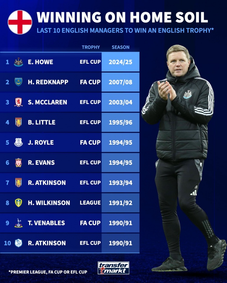 纽卡主帅埃迪-豪成为07-08赛季之后首位赢得国内赛事冠军的英格兰主帅,上位做到这点的是哈里-雷德克纳普。
