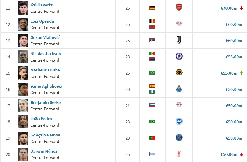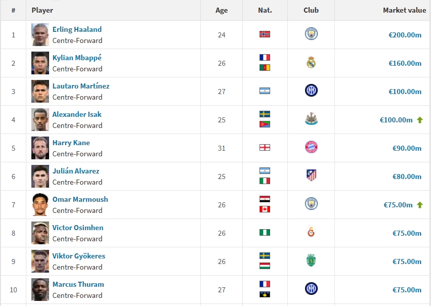 03月18日讯 德转更新英超球员身价榜后,在最新的全球中锋身价榜中,哈兰德居首,姆巴佩次之,伊萨克升至第四。