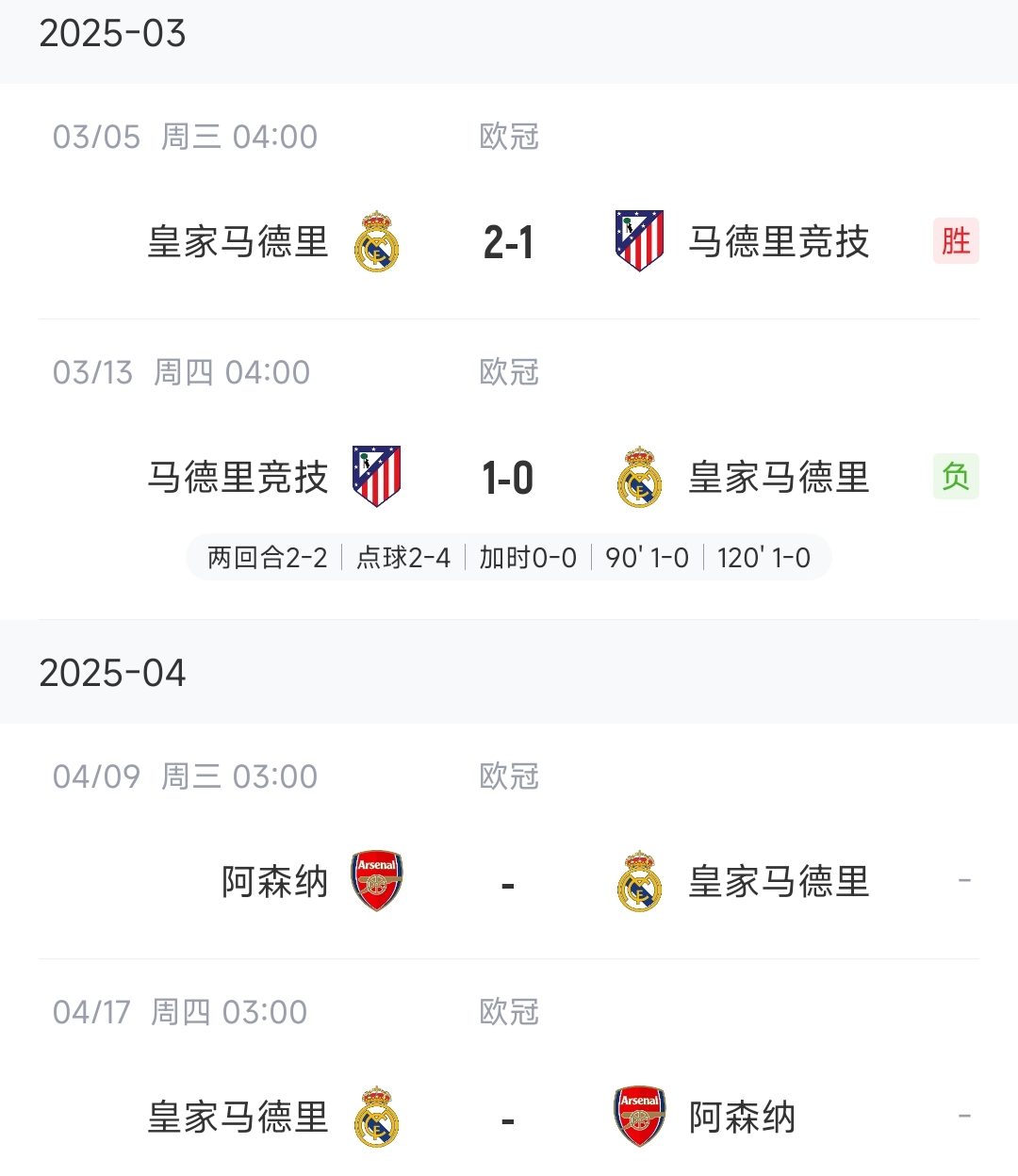 接下来的欧冠1/4决赛中,皇马将先客后主迎战英超球队阿森纳,这也是两队自2005/06赛季的欧冠1/8决赛后首次交手。
