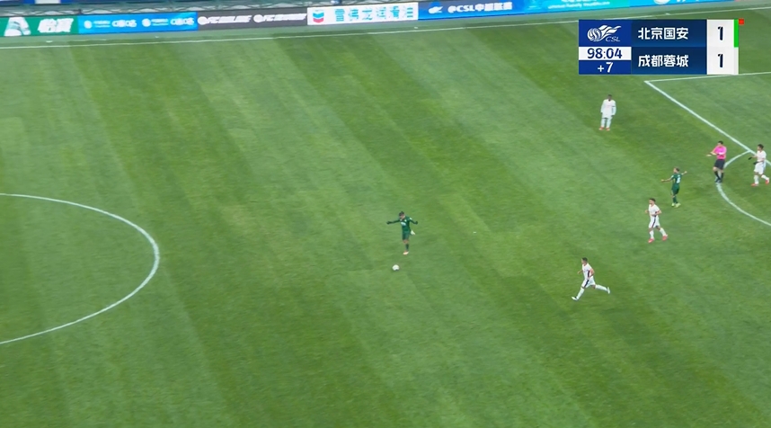 成都最后禁区外射门和弹子球一样乱弹了几下,先是弹到了马宁腿上,然后又弹向国安进攻方面,张玉宁得到球……
