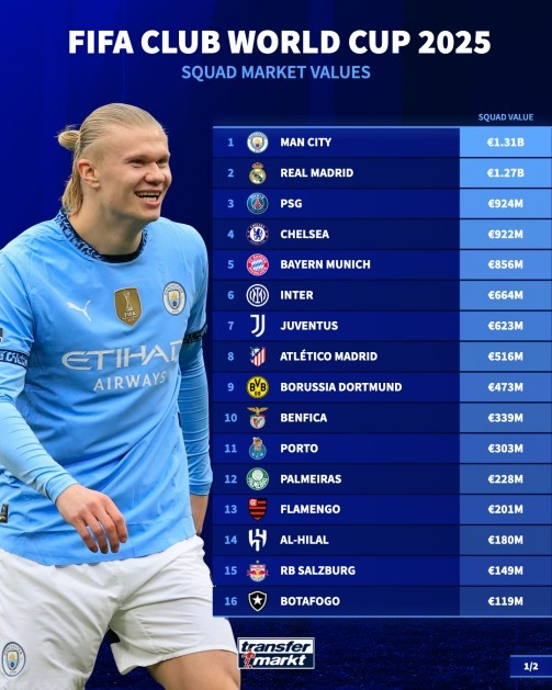 世俱杯参赛球队身价排名: