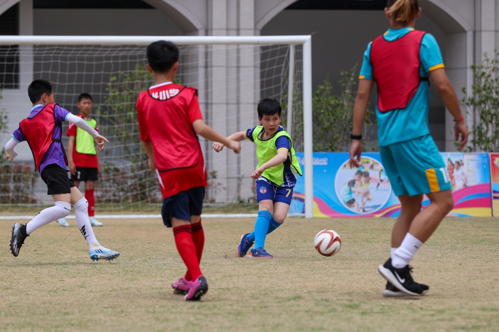 学生代表与嘉宾合影留念后,足球互动活动正式开启。在福建泉州青工足球俱乐部专业球员的带领下,小球员们进行了热身运动,为接下来的挑战做好准备。盘带接力大挑战中,小球员们带球穿梭在障碍物间,展现出扎实的球技和顽强的斗志;金球模式的足球友谊赛更是紧张刺激,每一次进攻都扣人心弦,现场欢呼声、加油声此起彼伏。