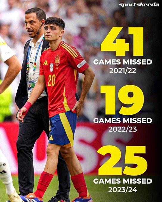 佩德里此前三个赛季因伤错过的比赛场数↓