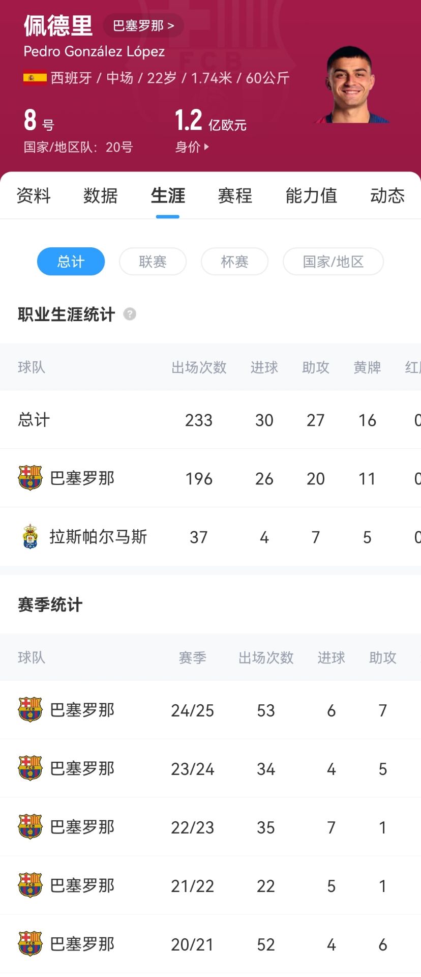 在2020/21赛季刚进入巴萨一线队的佩德里就在俱乐部比赛中全勤,并频繁地被召入西班牙各级国家队,在经历了一赛季的超负荷运转后,佩德里遭遇了腿筋重伤,并在之后伤情反复。
