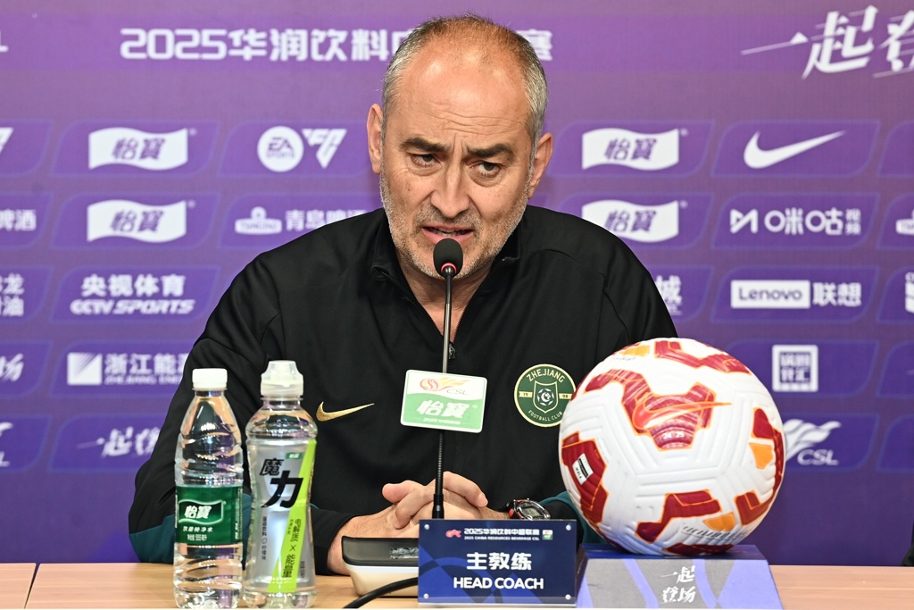 5月15日讯 明晚浙江队将在中超第13轮主场对阵河南。今天,浙江队主帅卡内达和球员岳鑫一同出席了赛前新闻发布会。