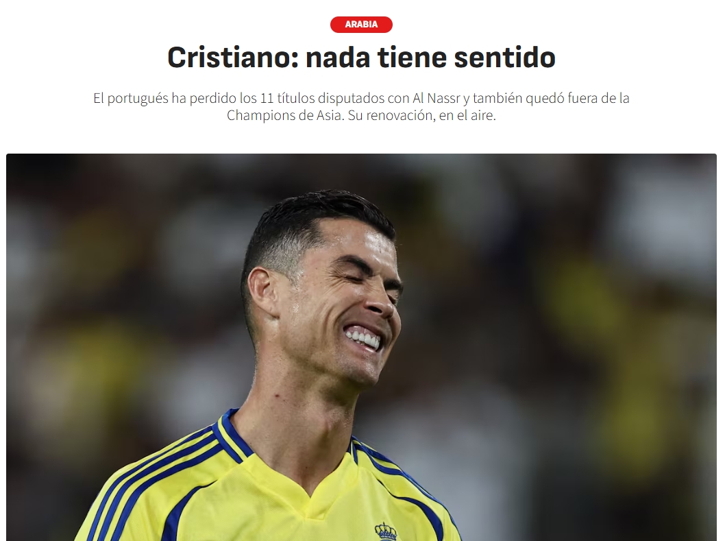 05月17日讯 沙特联第32轮,利雅得胜利1-1战平布赖代合作,确定无缘下赛季亚冠精英联赛。西媒《阿斯报》撰文谈到了C罗加盟球队至今的处境。