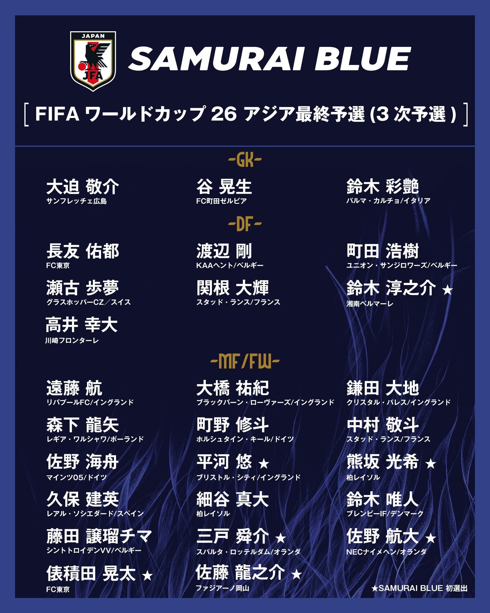 门将:大迫敬介(广岛)、谷晃生(町田泽维亚)、铃木彩艳(帕尔马)