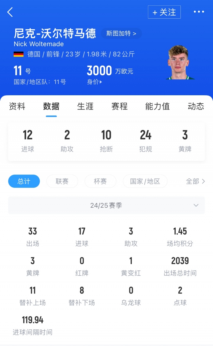 沃尔特马德时年23岁,上赛季为斯图加特出场33次,取得17粒进球和3次助攻,目前其德转身价已达3000万欧元。
