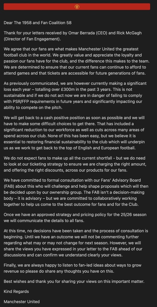 在给球迷组织的信中,曼联官方表示:“俱乐部每年都在遭受重大损失,如果不采取行动,俱乐部将面临未来几年无法遵守PSR(盈利和可持续发展规则)/FFP(财务公平竞争)要求的风险,这将严重影响我们在球场上的竞争力。